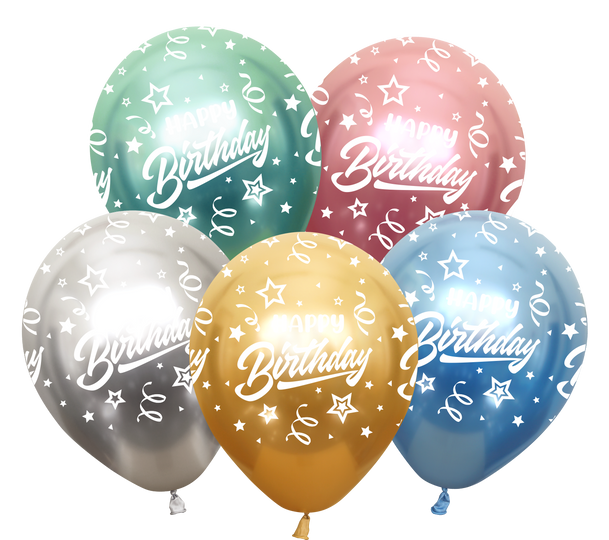 Globos de látex surtidos con espejo de 12" Happy Birthday (25 por bolsa), impresión en 5 lados