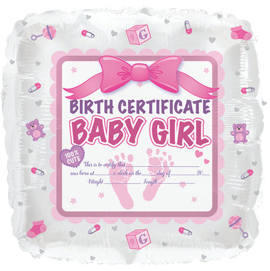 Globo de aluminio con certificado de nacimiento de niña de 18"