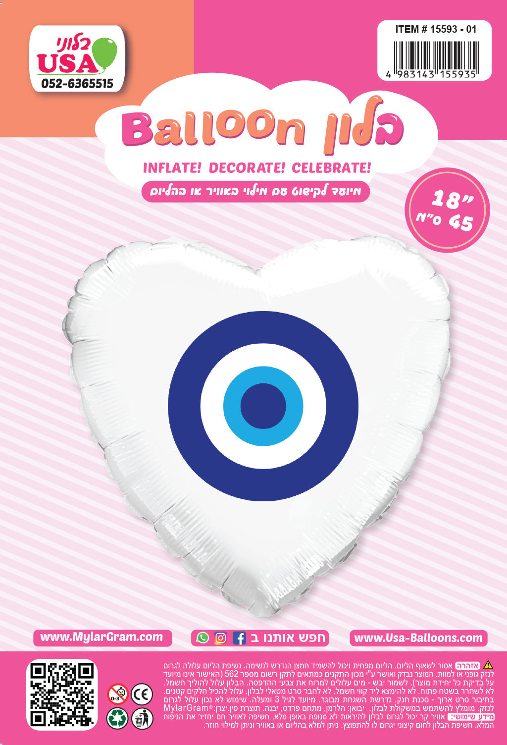 Globo Hebreo Corazón Blanco Ojo Azul 18"