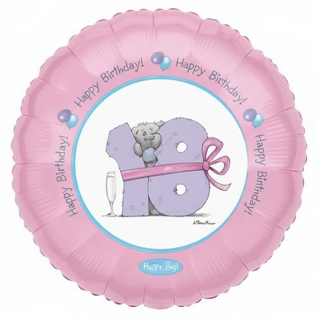 Celebrate a milestone birthday with this charming 18" Happy Birthday 18th Bear Balloon. This round balloon features a delightful design with a cute bear peeking out from behind the number "18," which is adorned with a pink ribbon. The background is a soft pastel pink, and the border of the balloon is decorated with the repeated phrase "Happy Birthday!" along with small blue balloons for added festivity.