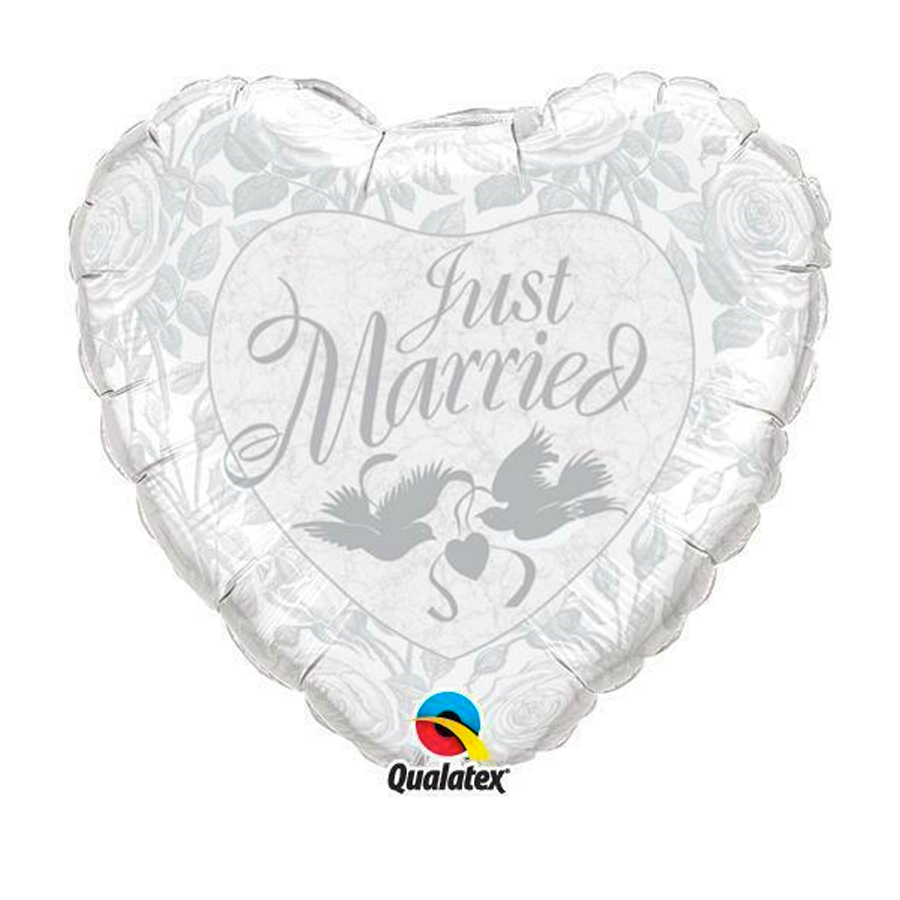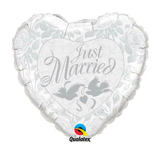 Globo de corazón plateado y blanco perla recién casados de 18"