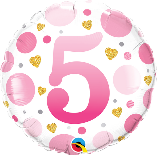Globo metalizado con puntos rosados, redondo, de 18" y 5 años de edad