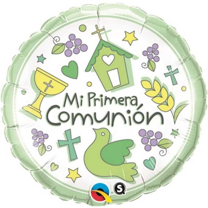 Globo de aluminio redondo con símbolos de Mi Primera Comunión (español) de 18"