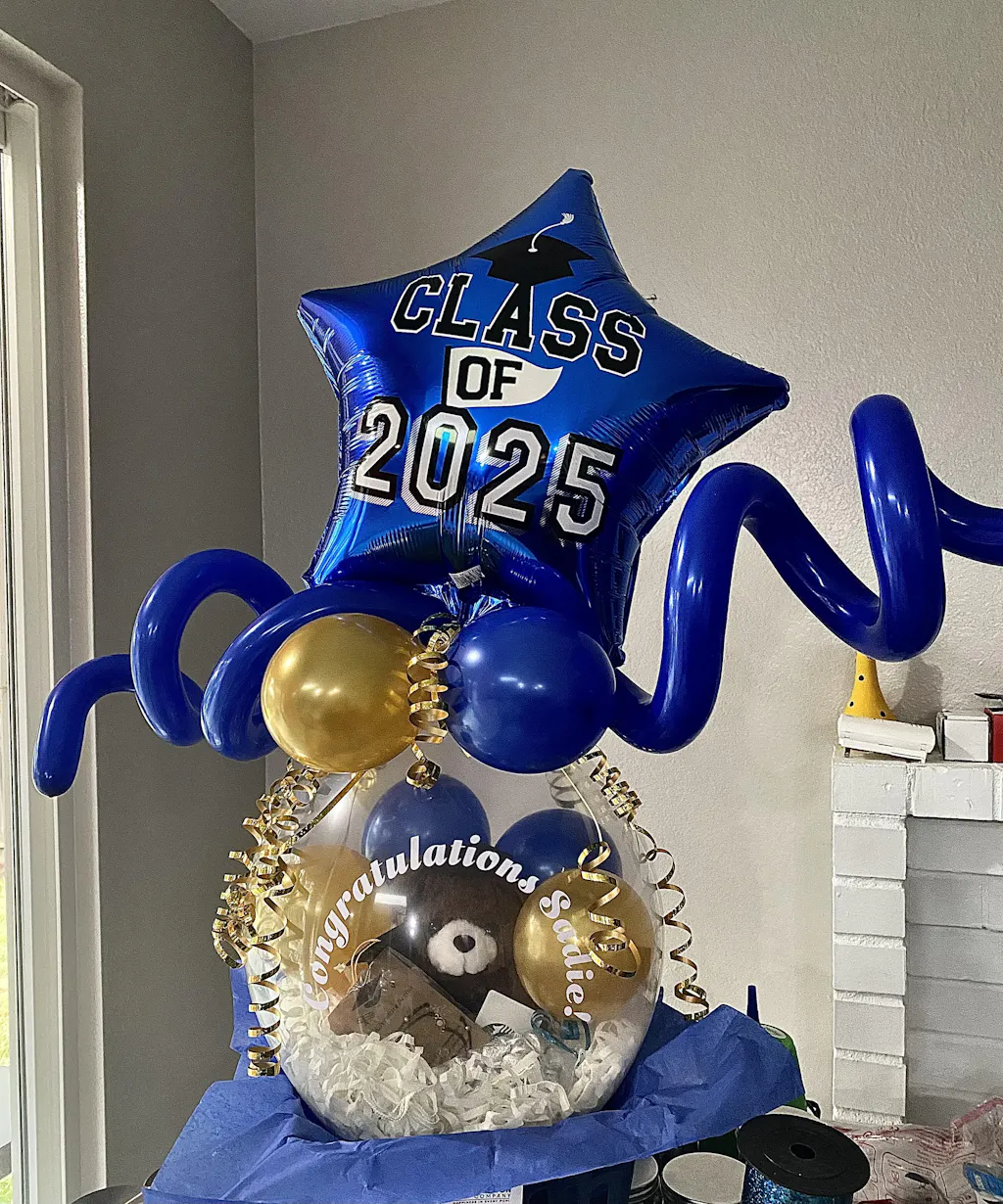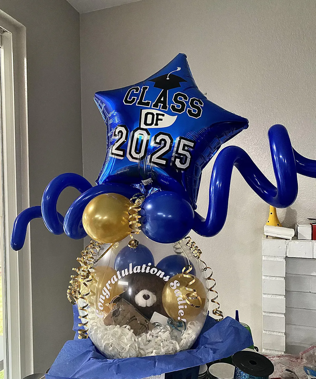 Celebrate the achievements of the Class of 2025 with this vibrant 18-inch blue foil balloon. Shaped like a star, this balloon features bold black and white lettering that proudly states "CLASS OF 2025." The design is complemented by a graduation cap graphic, adding a festive touch to any graduation party or event.