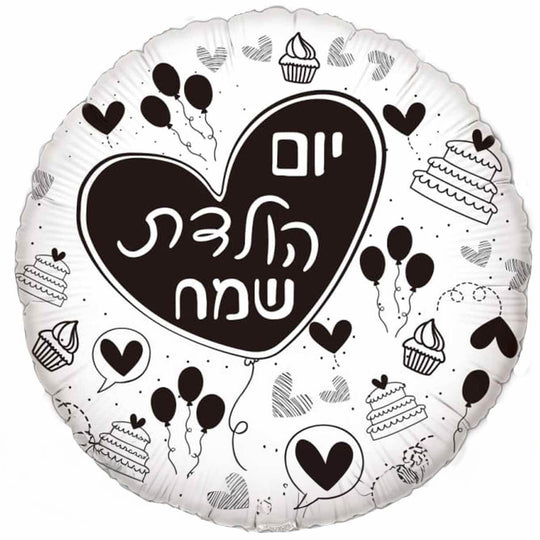 18" Happy Birthday Round Black & White Hebrew Foil Balloon