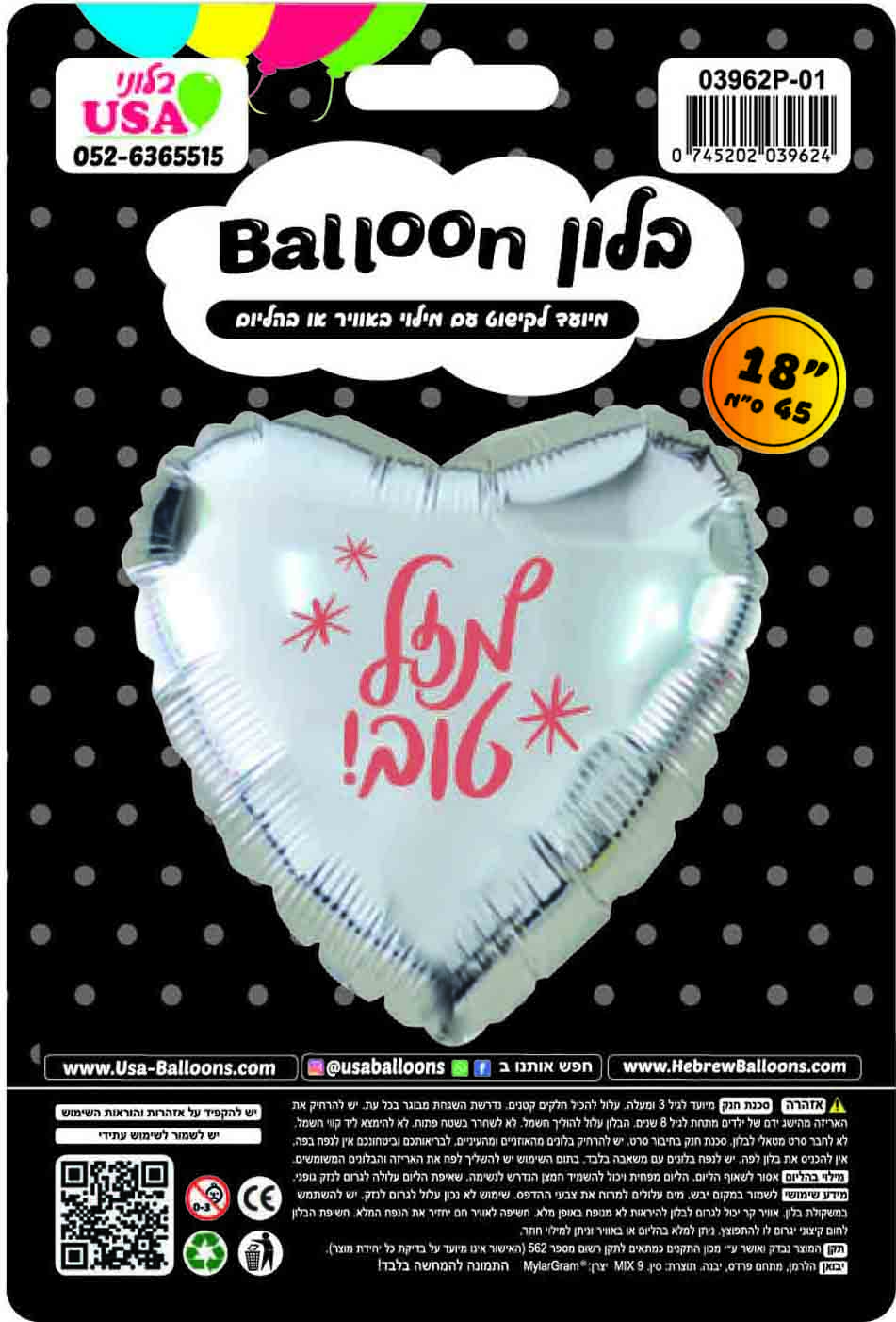 Globo de aluminio hebreo plateado/rosa con forma de corazón Mazel Tov de 18"
