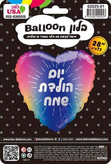 Globo de aluminio hebreo con forma de corazón arcoíris de feliz cumpleaños de 28"