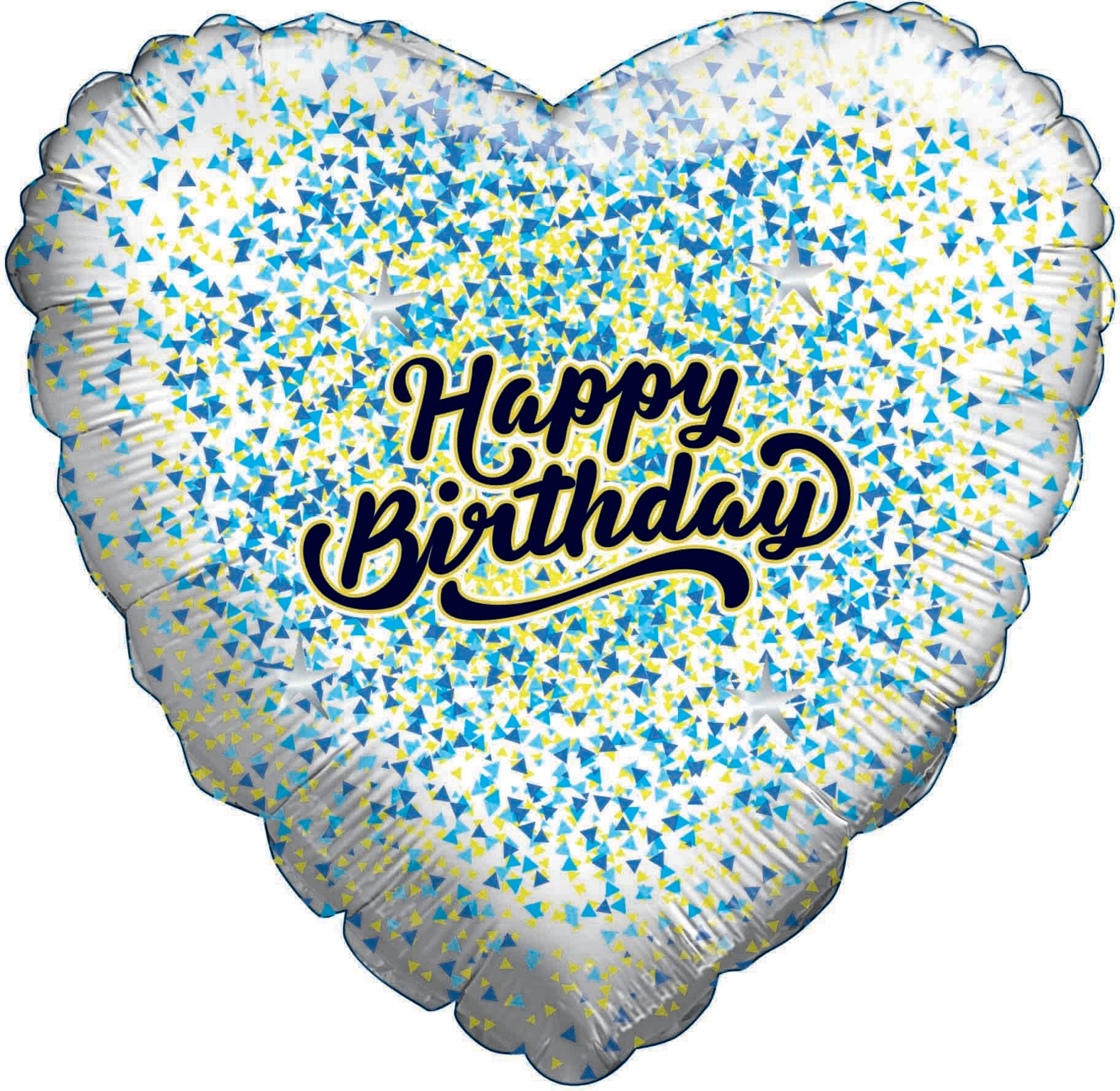 Globo de corazón blanco moteado de feliz cumpleaños de 28" azul/dorado