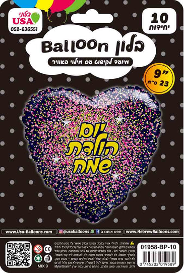 Globo de aluminio con forma de corazón de 9" Airfill Only Happy Birthday Glitter hebreo dorado/rosa negro con forma de corazón