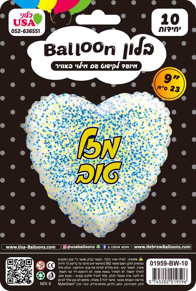 Globo de lámina de corazón blanco dorado/azul con purpurina hebrea Mazal Tov de 9" Airfill Only