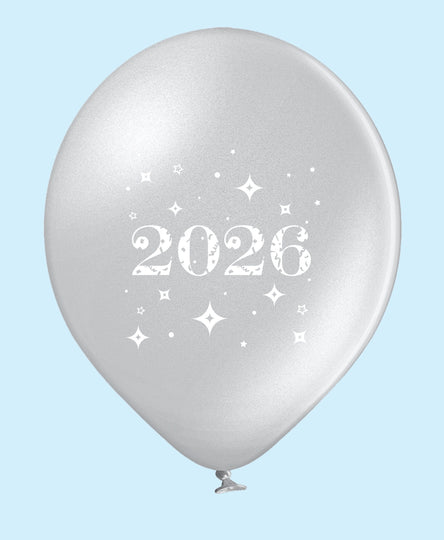 11" Year 2026 Stars Printed Latex Balloons Silver (25 Per Bag)
