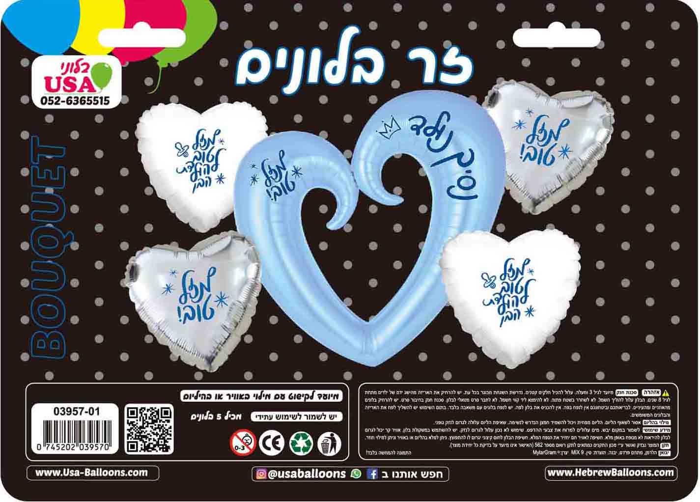 Ramo de 5 piezas Nace un Príncipe Corazón Abierto Globo de Aluminio Hebreo