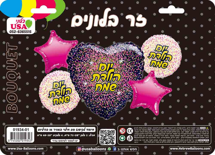 Bouquet 5pc Feliz Cumpleaños Hebreo Globo de Aluminio Negro/Dorado/Rosa