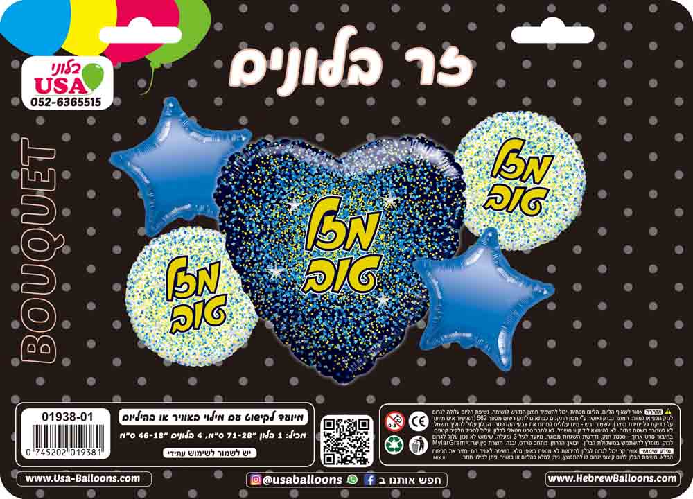 Bouquet 5 globos de aluminio Mazal Tov hebreo negro/dorado/azul