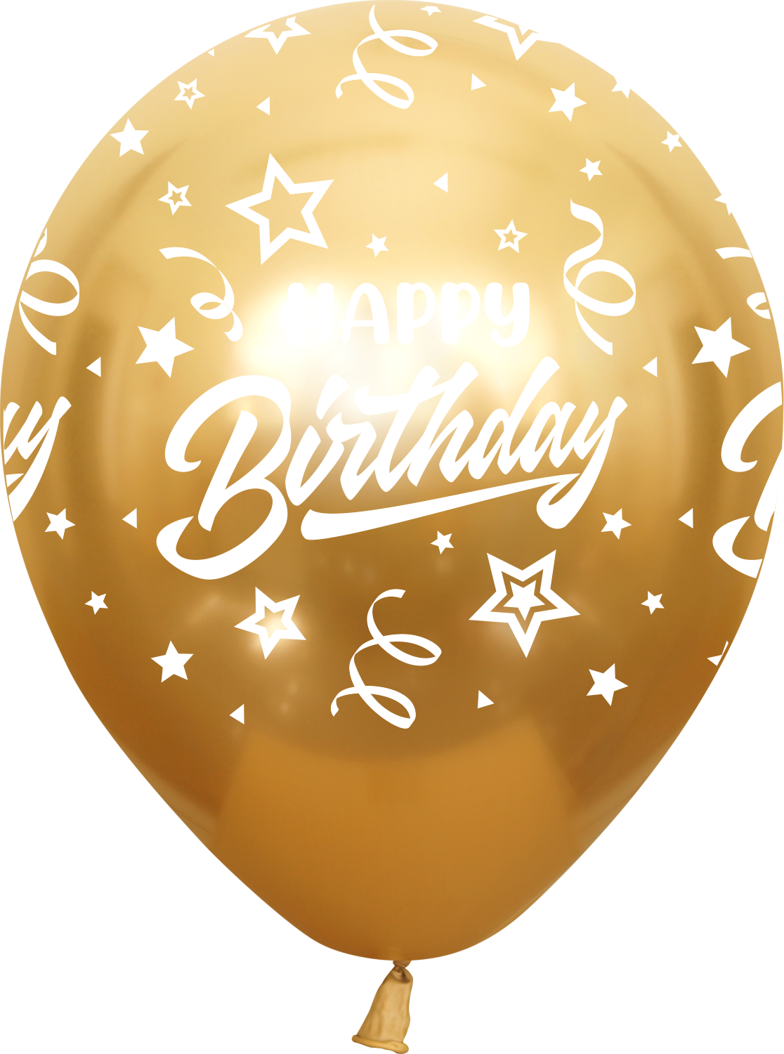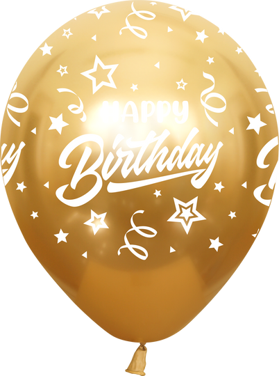 12" Mirror Happy Birthday All Around Gold Latex Balloons (25 Per Bag) 5 Side Print