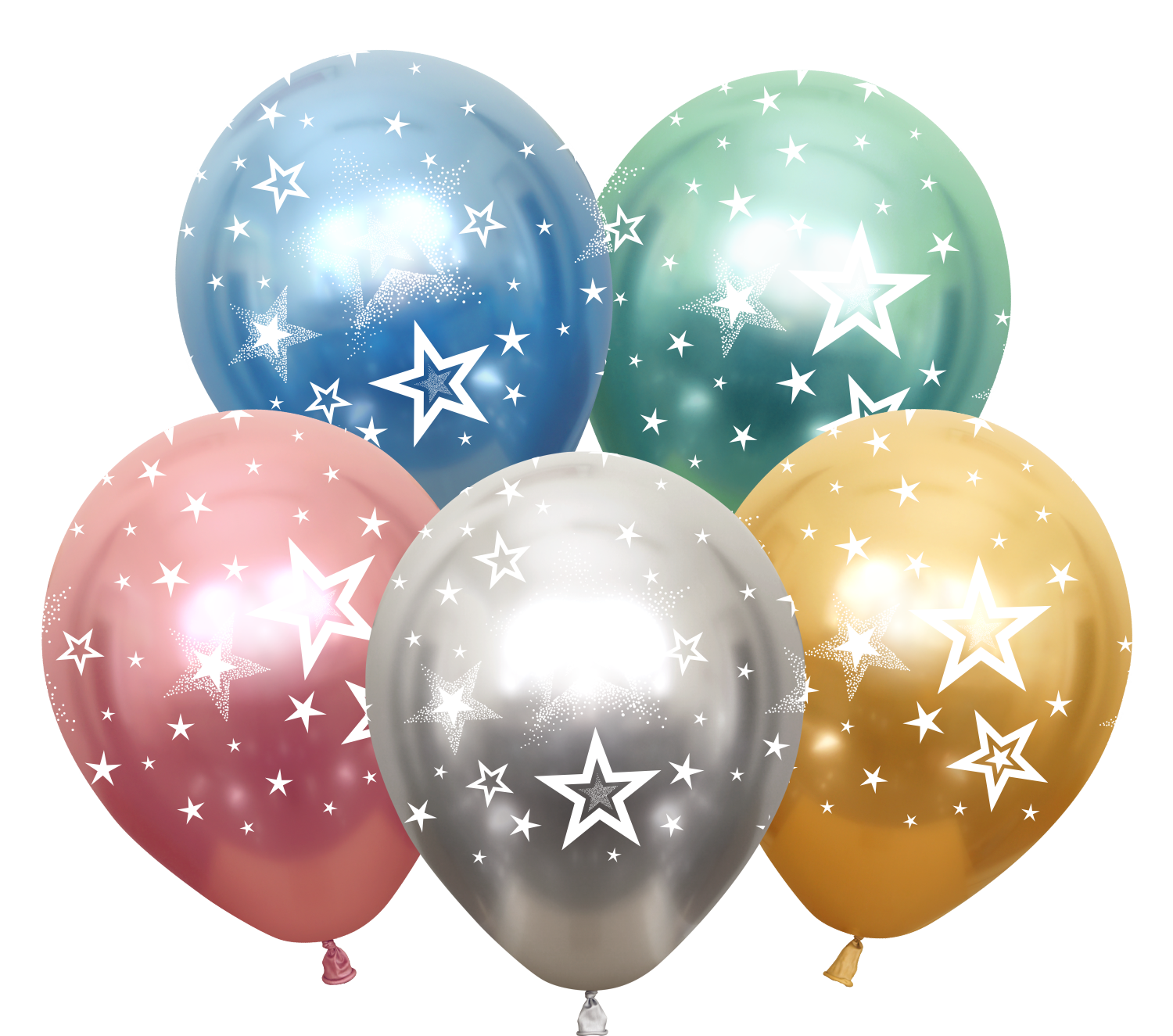 12" Mirror Stars All Around Assorted Latex Balloons (25 Per Bag) 5 Side Print