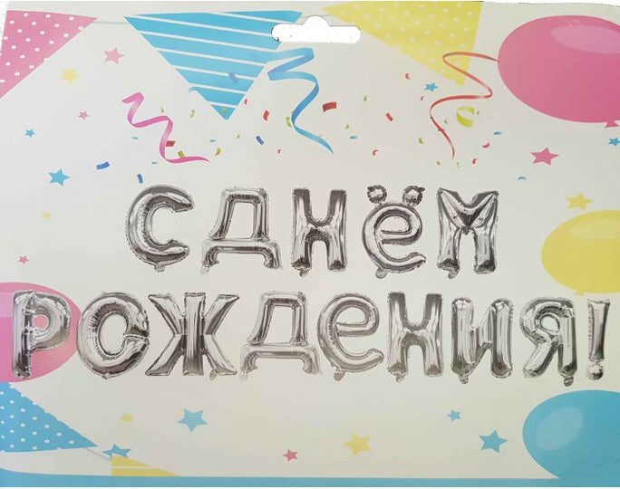 Celebrate a special birthday with this 16" Airfill Only Happy Birthday Russian Silver Kit Foil Balloons. These stylish balloons spell out "С ДНЁМ РОЖДЕНИЯ!" in silver foil, adding a touch of elegance to any birthday party. Perfect for creating a festive atmosphere, these balloons are designed to be filled with air only and will make a stunning decoration for your celebration. The set includes individual letters that can be easily arranged to spell out the birthday message in Russian. Make your loved one's birthday unforgettable with these eye-catching and unique balloons!