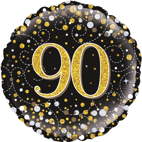 18" 90th Sparkling Fizz Birthday Black & Gold Holographic Oaktree Foil Balloon