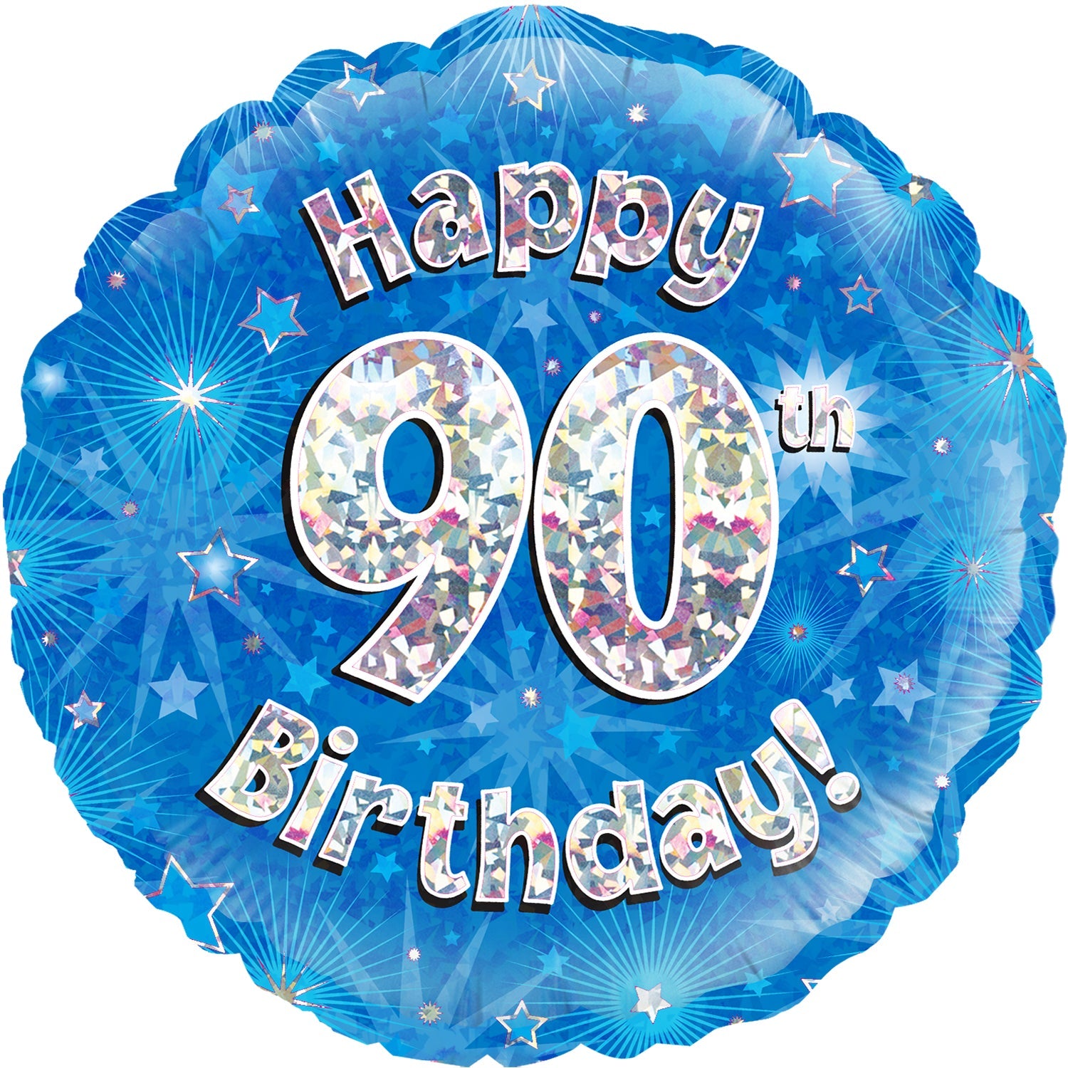 18" Happy 90th Birthday Blue Holographic Oaktree Foil Balloon