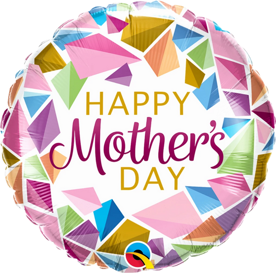 Celebrate Mother's Day with this vibrant 18-inch round foil balloon. Featuring a delightful array of colorful geometric gem shapes in pink, blue, green, yellow, and purple, this balloon adds a festive touch to any celebration. The center of the balloon prominently displays the heartfelt message "Happy Mother's Day" in elegant gold and magenta lettering. Perfect for decorating parties or gifting to show your appreciation, this durable foil balloon is sure to bring a smile to any mother's face.