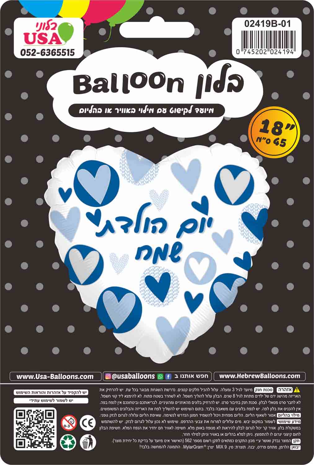 18" Happy Birthday Blue Hearts Hebrew Foil Balloon