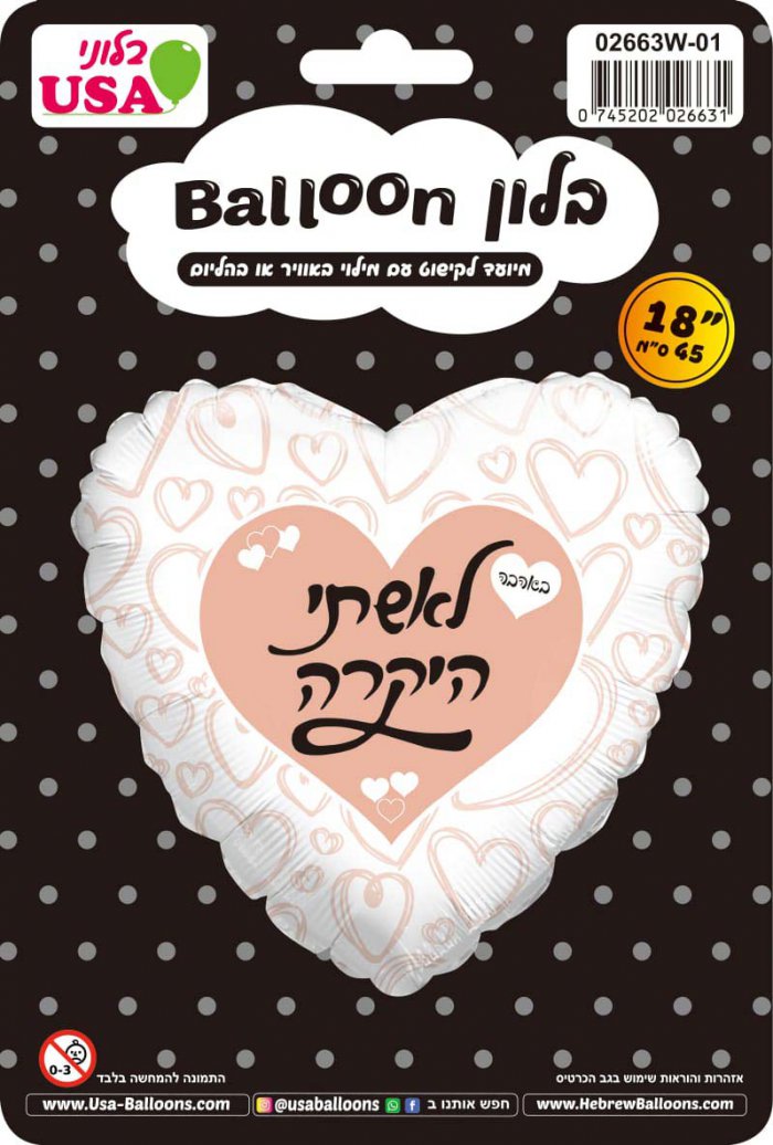 18" To My Wife With Love White Heart Hebrew Foil Balloon