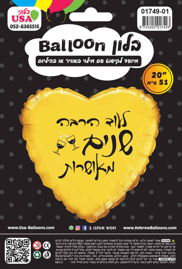 20" For Many More Happy Years Gold Heart Hebrew Foil Balloon