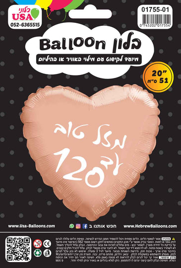 20" Mazel Tov Until 120 Rose Gold Heart Hebrew Foil Balloon