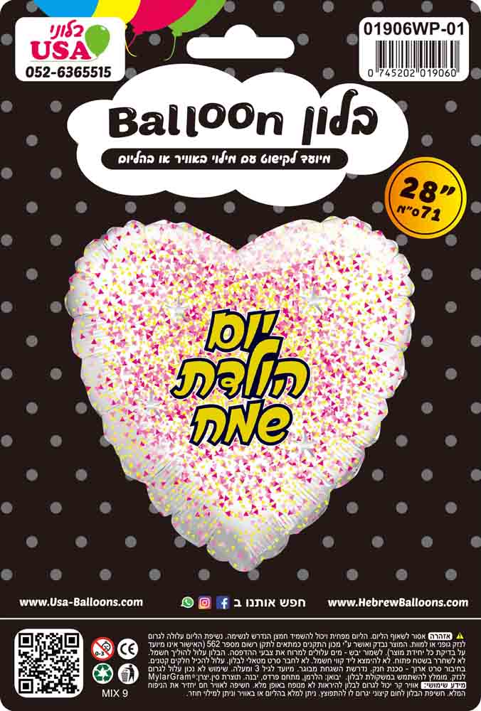 28" Happy Birthday Hebrew Glitter Gold/Pink White Heart Foil Balloon