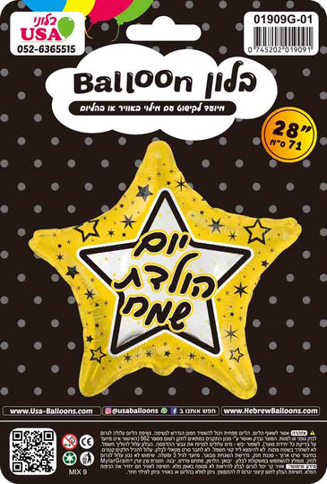 28" Happy Birthday Hebrew Gold/White Star Foil Balloon