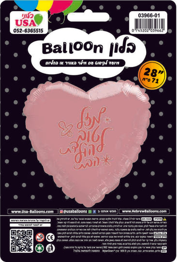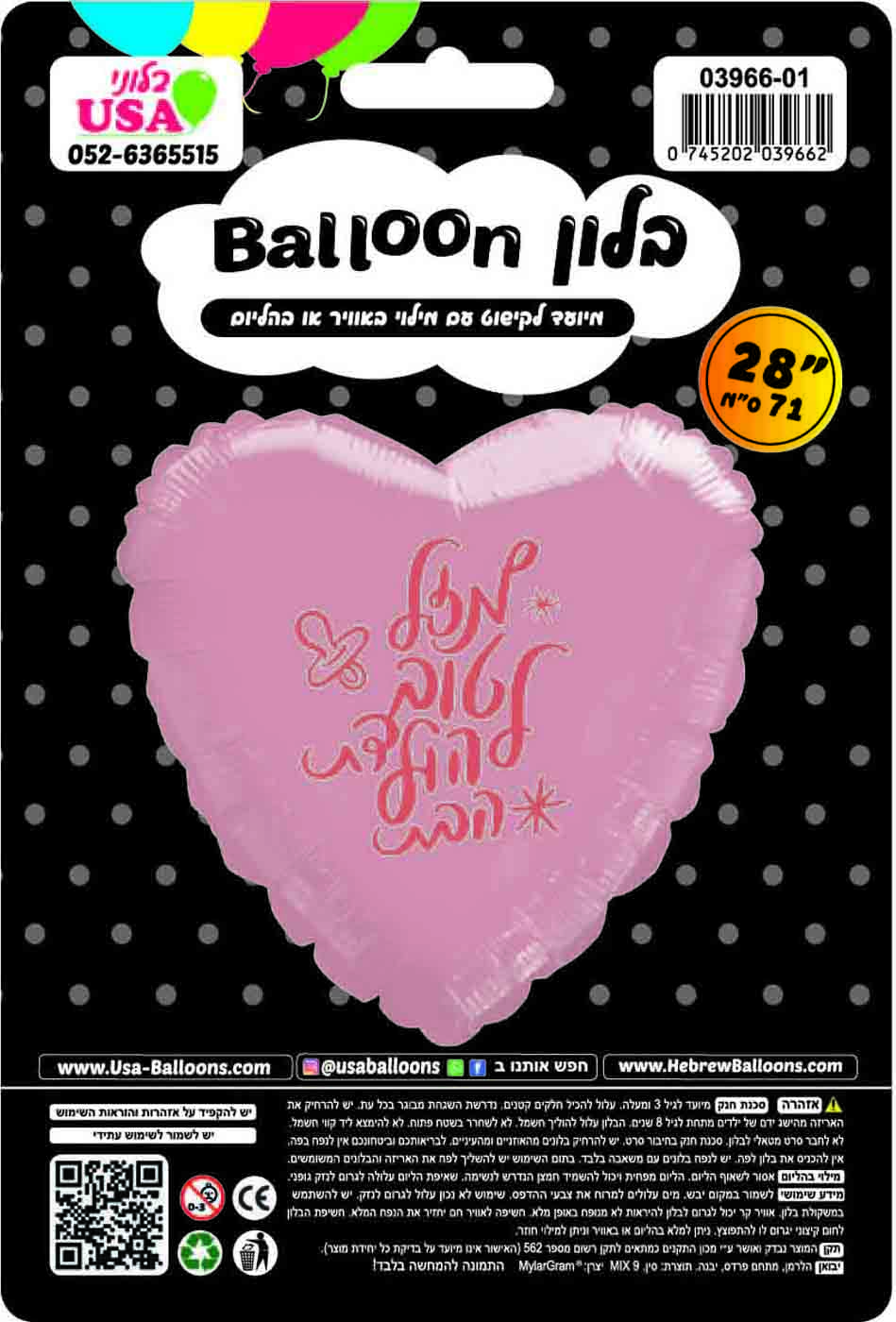 28" Mazel Tov Baby Girl Pink Heart Hebrew Foil Balloon