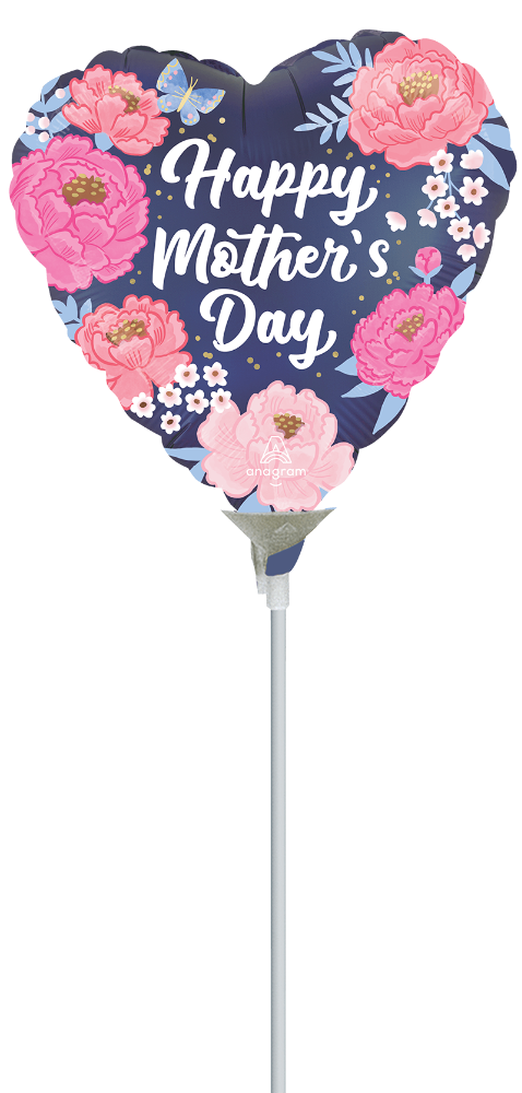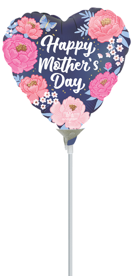 Celebrate Mother's Day with this beautiful 4" Airfill Only Satin Happy Mother's Day Peony Garden Foil Balloon. This heart-shaped balloon features a stunning design with vibrant pink peonies and delicate white flowers set against a rich, dark background. The phrase "Happy Mother's Day" is elegantly displayed in white script, making it the perfect addition to any Mother's Day celebration. Please note that sticks are sold separately.