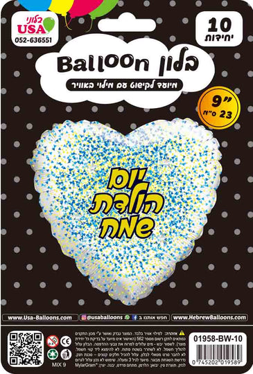 9" Airfill Only Happy Birthday Glitter Hebrew Gold/Blue White Heart Foil Balloon