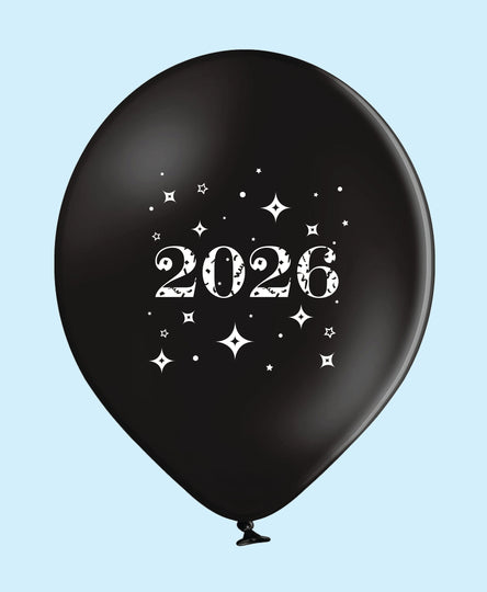 11" Year 2026 Stars Printed Latex Balloons Black (25 Per Bag)